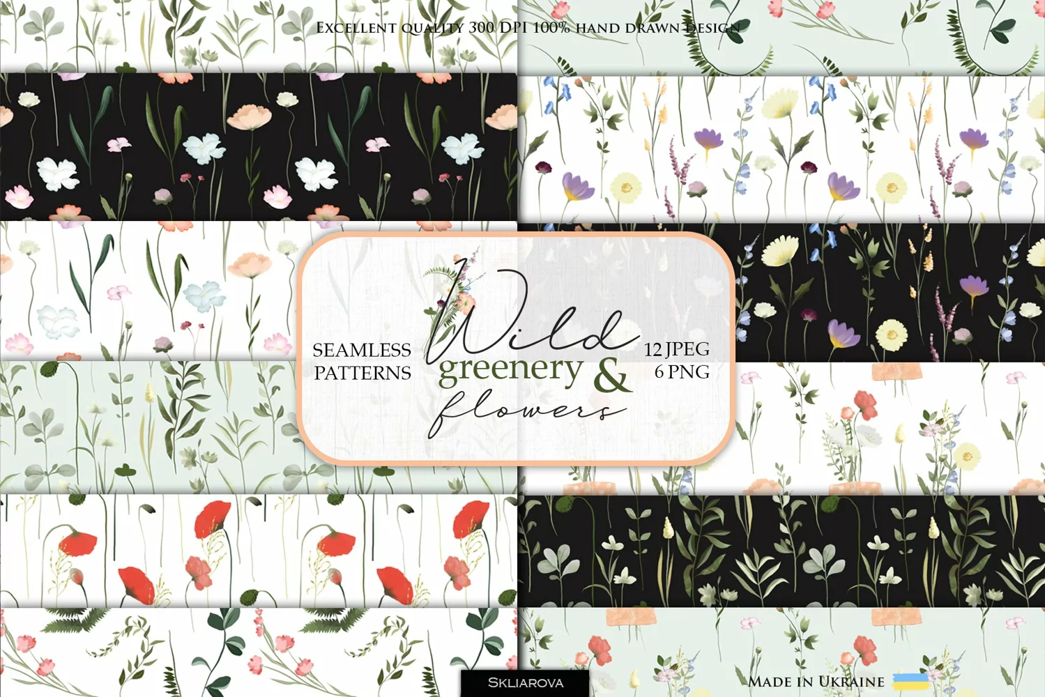 12 .jpeg seamless digital papers/patterns + 6 .png with greenery and wildflowers, size 5000×5000 px. (16.66×16.66”)