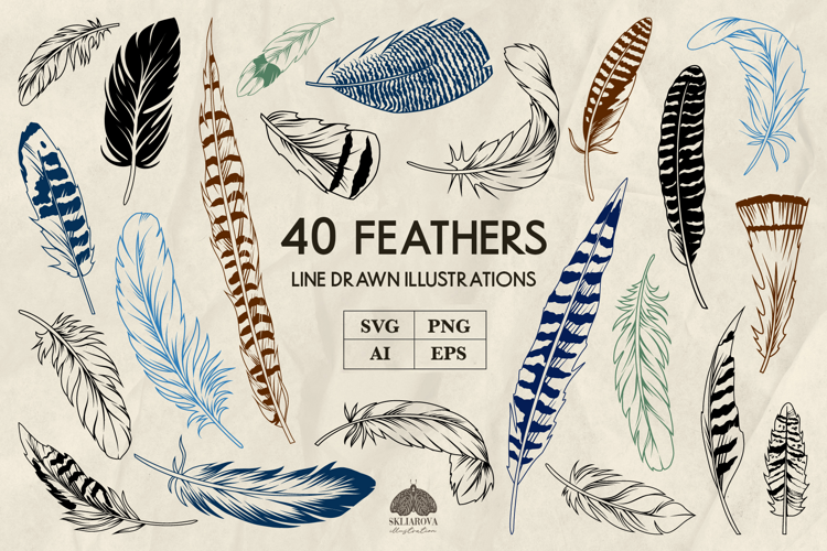 - 40 feathers, hand drawn line illustrations (SVG, AI, EPS, PNG)