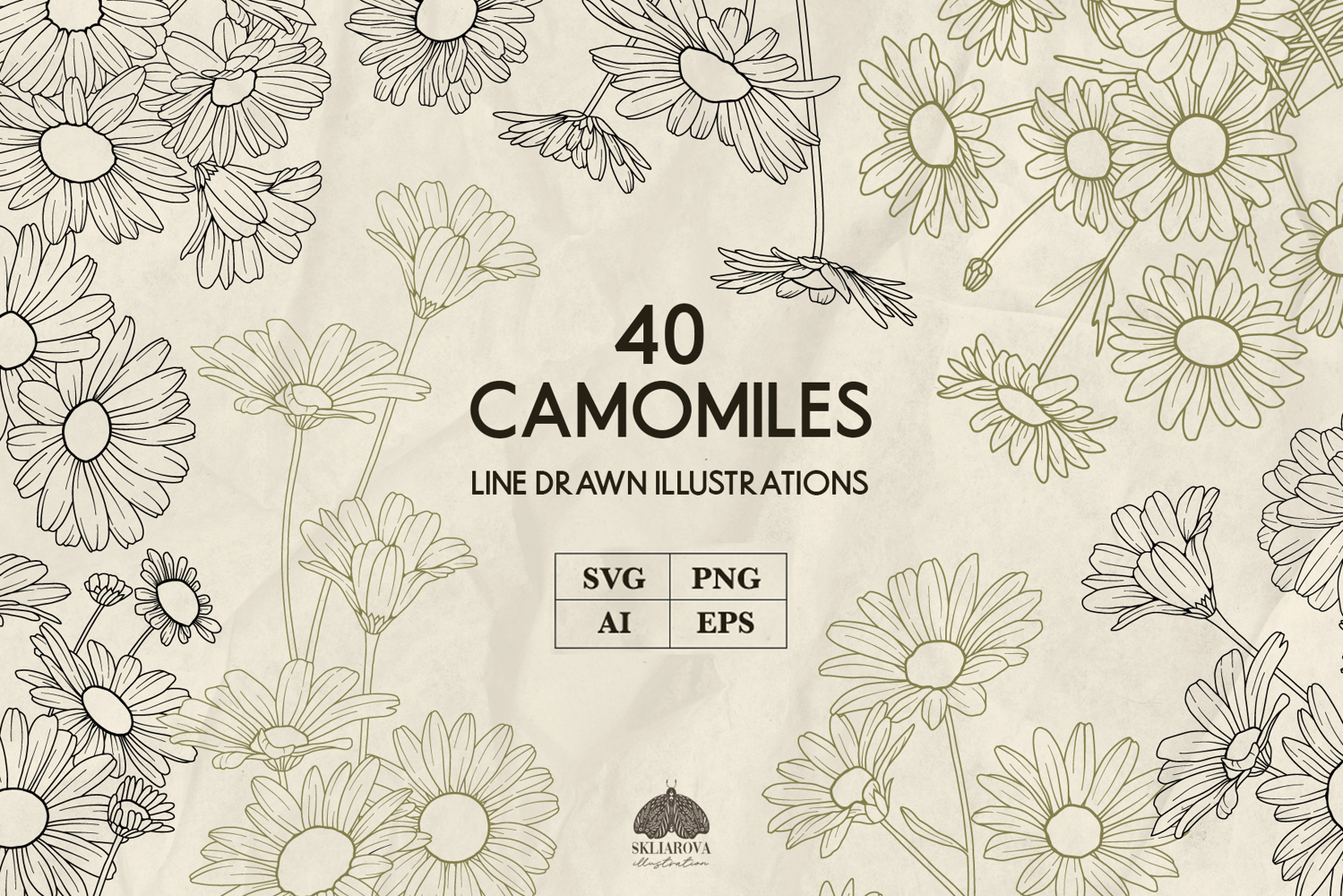 • 40 hand drawn Camomile flower illustrations (flowers, frames, decorative elements) (SVG, AI, EPS, PNG)