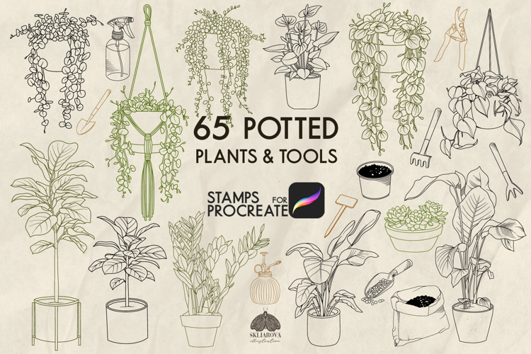 - 65 line art Potted Plants and Garden Tools - stamp brushes for Procreate