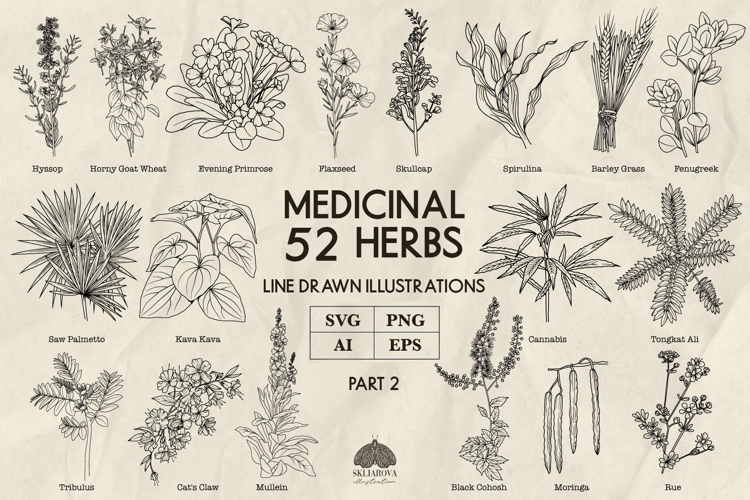- 52 medicinal herbs, botanical hand drawn line illustrations (SVG, AI, EPS, PNG)