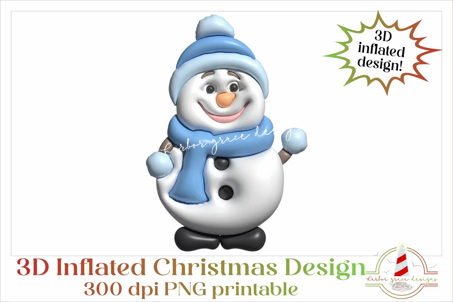 This listing includes the "3D Inflated Design, Snowman PNG, 300 dpi" - an exclusive bundle of printable designs by Harbor Grace Designs.