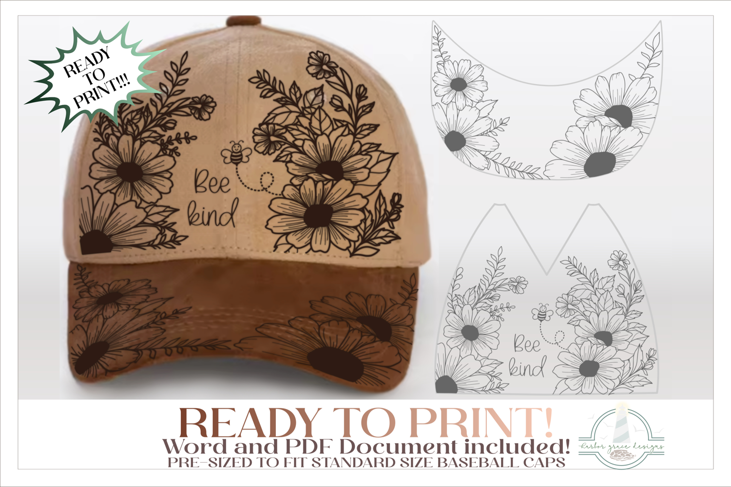 This listing includes the ‘Bee Kind Bees and Daisies Baseball Cap Hat Burning Design' -- an exclusinve design by Harbor Grace Designs.