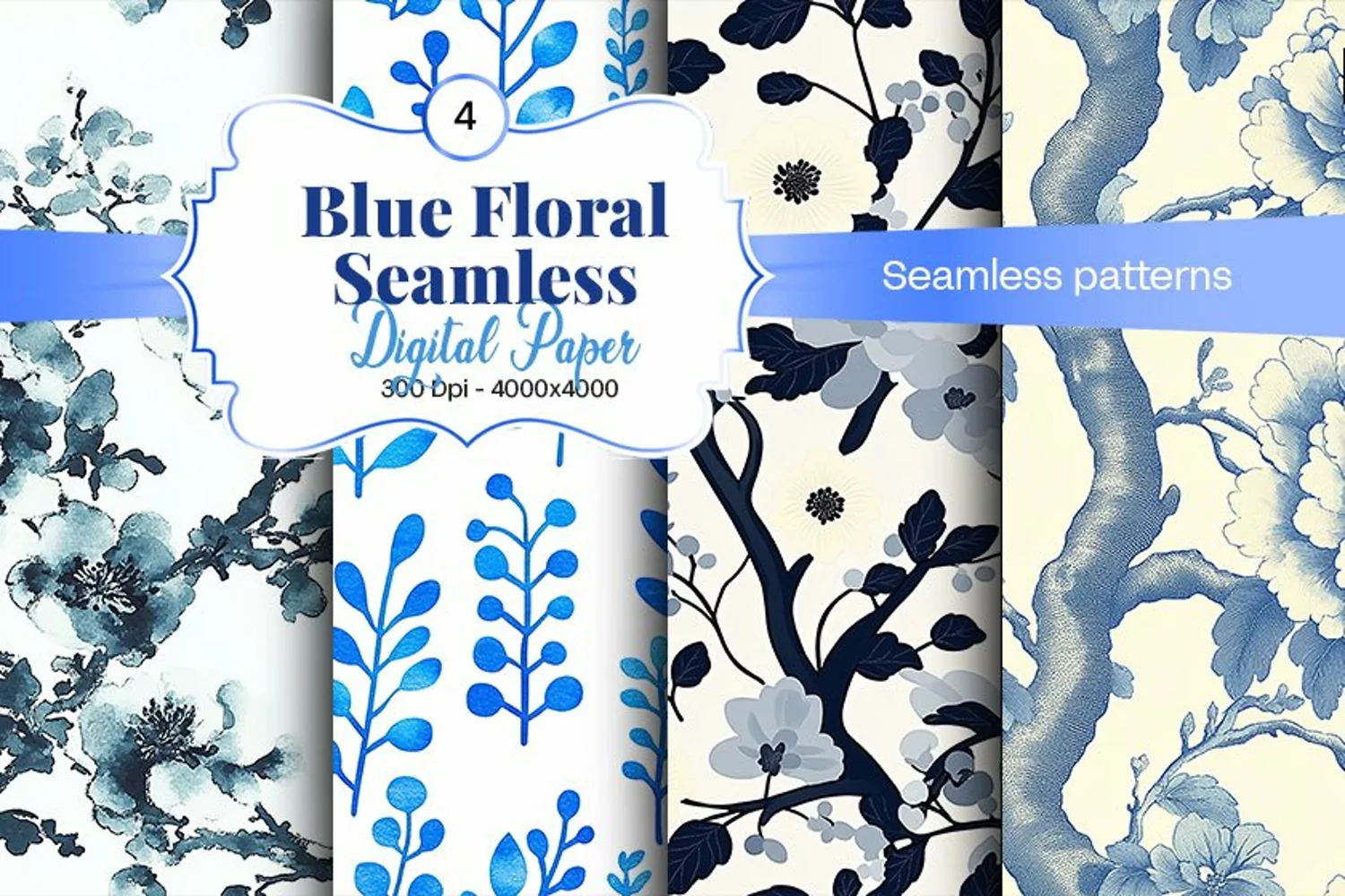 Blue Floral Digital Paper - 04 Seamless Patterns