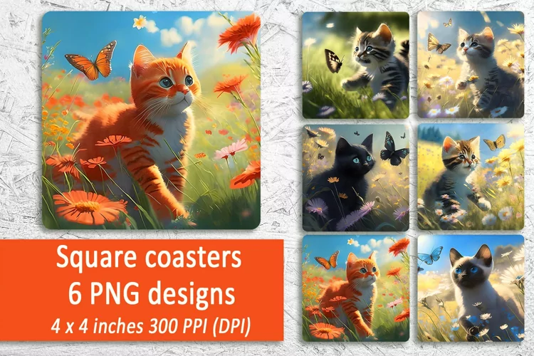 Kitty in summer Square Coaster. Cat and butterfly Sublimation Coaster Designs bundle png