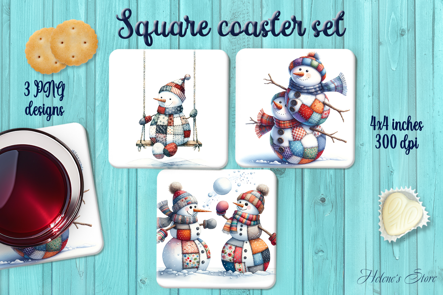 3 abstract square coaster template key chain, square coaster wrap designs for mug, square keychain design sublimation set, magical watercolor illustrations graphics image, pastel patchwork kids delicate design, cute funny winter season, playful snowmen illustration, folk patchwork xmas design
