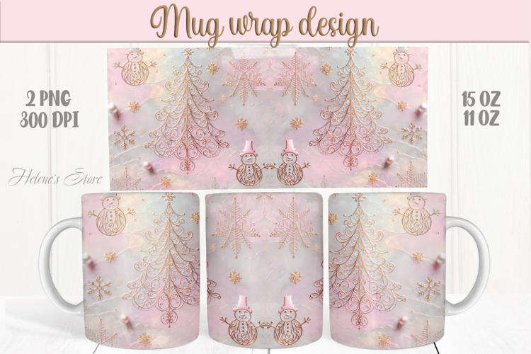 Christmas tree & snowmen mug wrap png|Pink & gold mug design