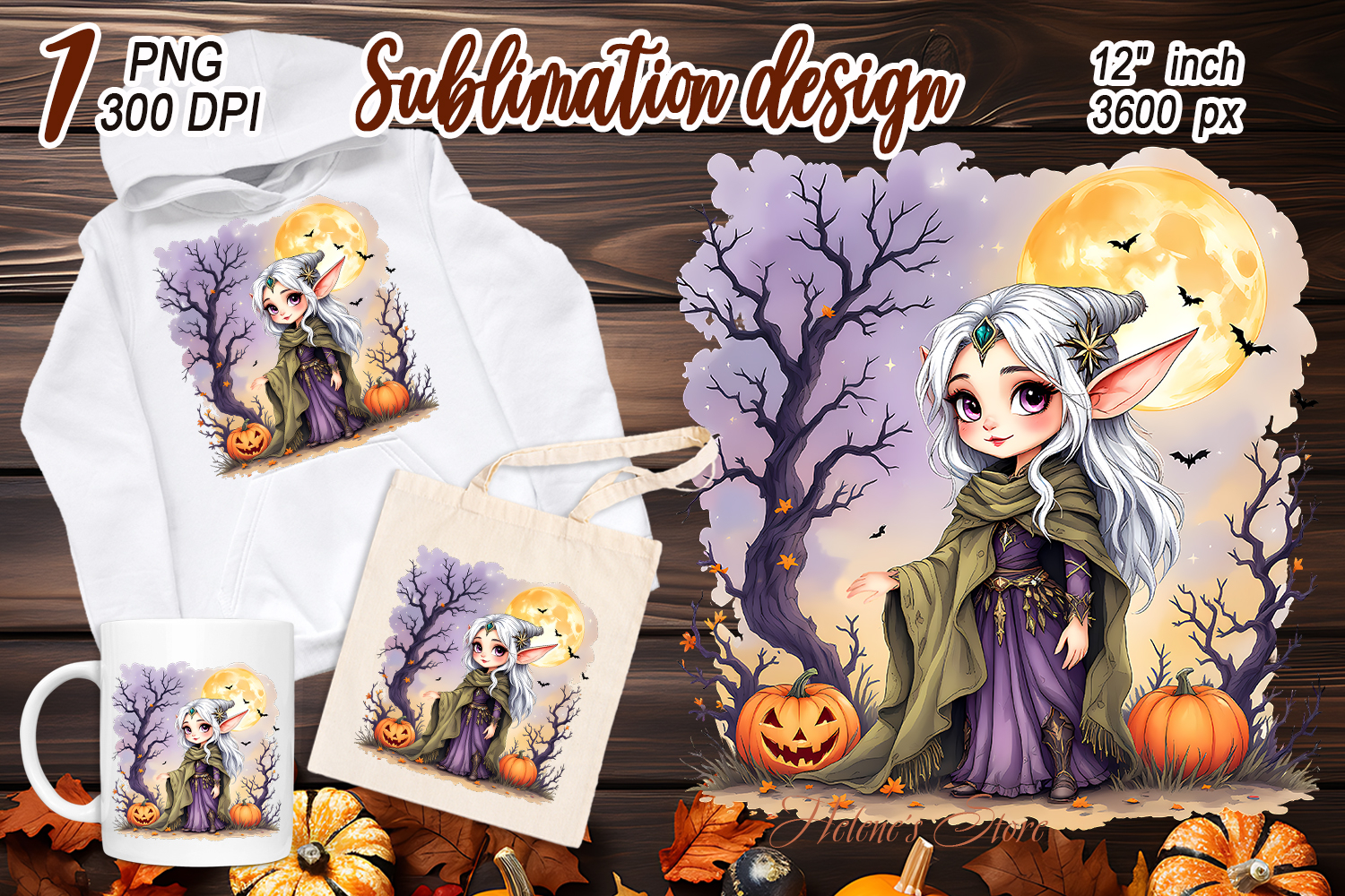 Cute watercolor Halloween elf girl sublimation design png example image 1