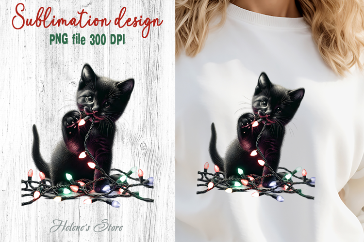 Christmas lights & black cat clipart| Winter t shirt designs example image 1