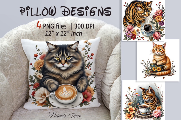 cute pillow case print, pillow case sublimation design png, cozy home decor, printable sublimation set design bundle, coffe cup cat and flowers pattern, art coffee floral illustrations, cute cats coffee lover images