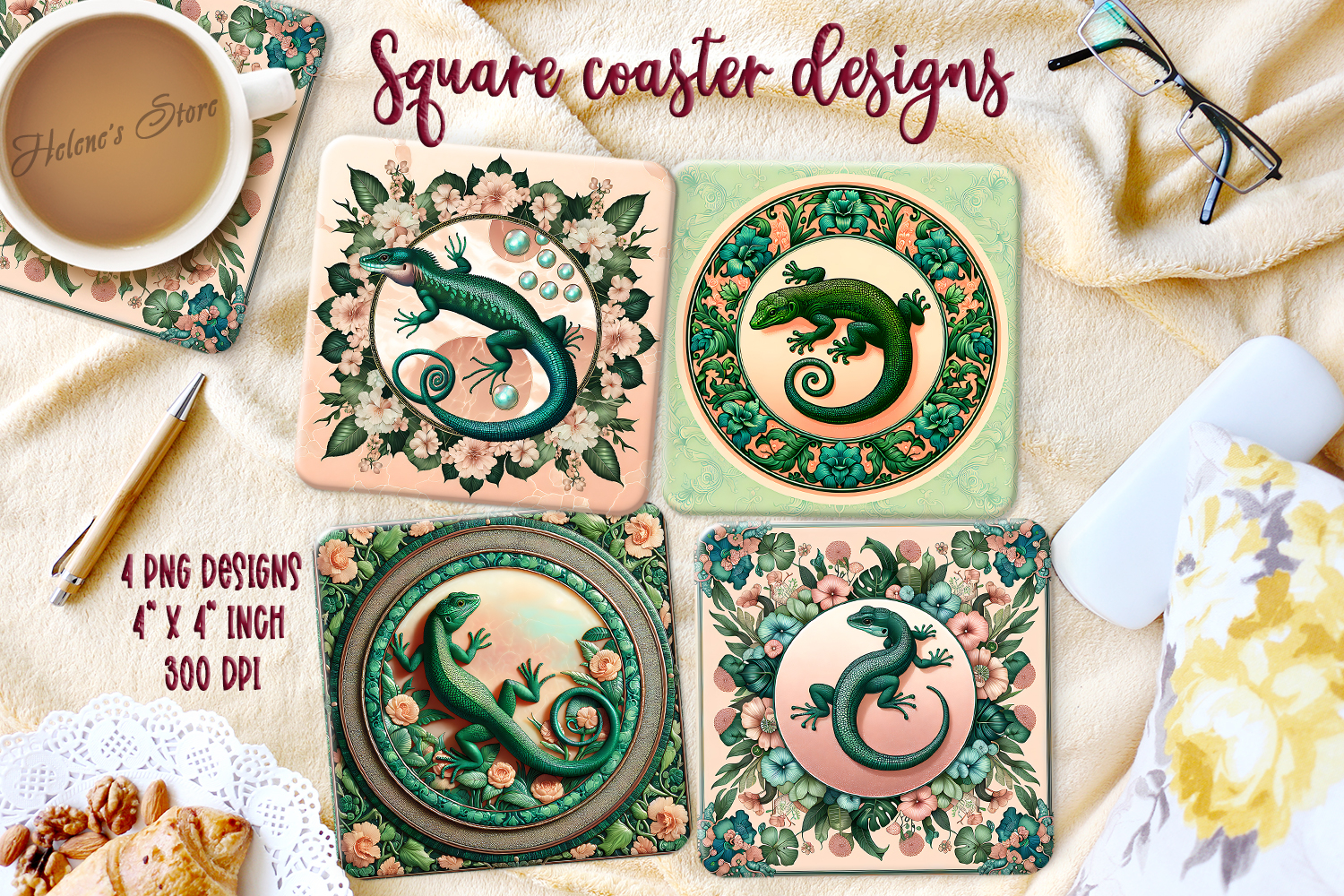 Cute lizard in round floral frame square coaster designs png example image 1