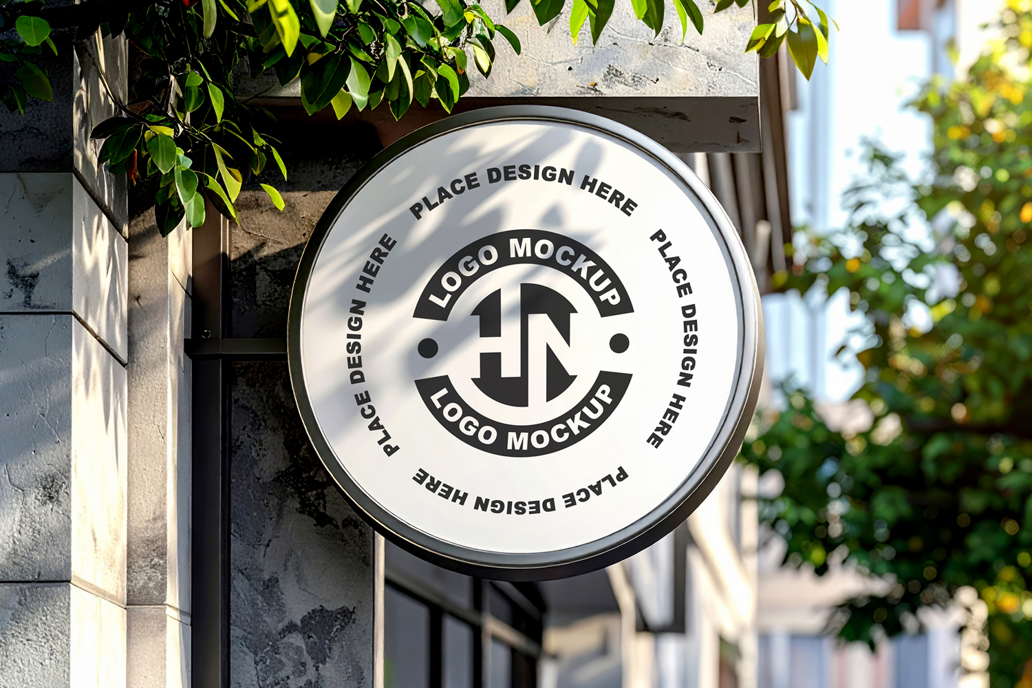 Mockup Greenery Sunlight Logo Display Cafe Signage Circular Sign Outdoor Branding Projecting Sign Blade Sign Retail Storefront