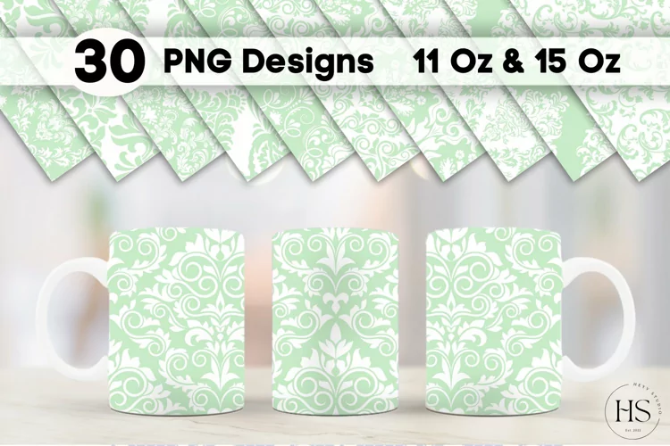 Similar Design Products to 30 Green Damask Pattern Mug Sublimation PNG Bundle, Mug Wrap