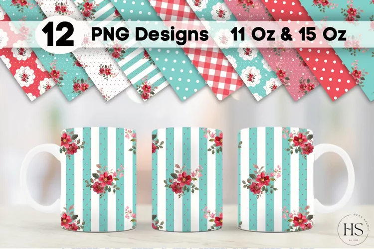 12 Shabby Chic Flowers Mug Sublimation PNG Bundle, Mug Wrap