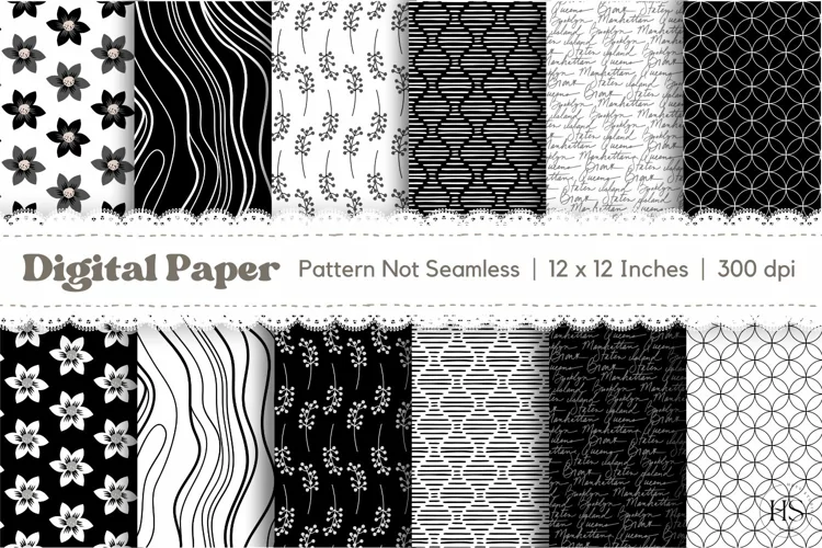 12 Monochrome Flowers Digital Paper, Floral PNG Background