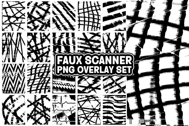 This set includes 20 faux scanner/copier overlay textures in transparent PNG format. Each design was created using AI and refined in Photoshop for crisp detail and bold, high-contrast black (no grey tones or shadows).