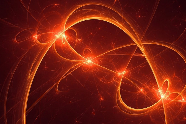 A vibrant digital art piece featuring swirling orange lines against a dark background, creating a dynamic and energetic visual effect.