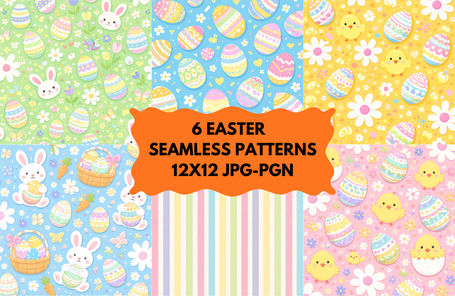 This colorful Easter seamless patterns bundle includes 6 high-quality repeating designs, perfect for creating backgrounds, digital paper, party decorations, scrapbooking, packaging, invitations, kids projects, and digital designs.