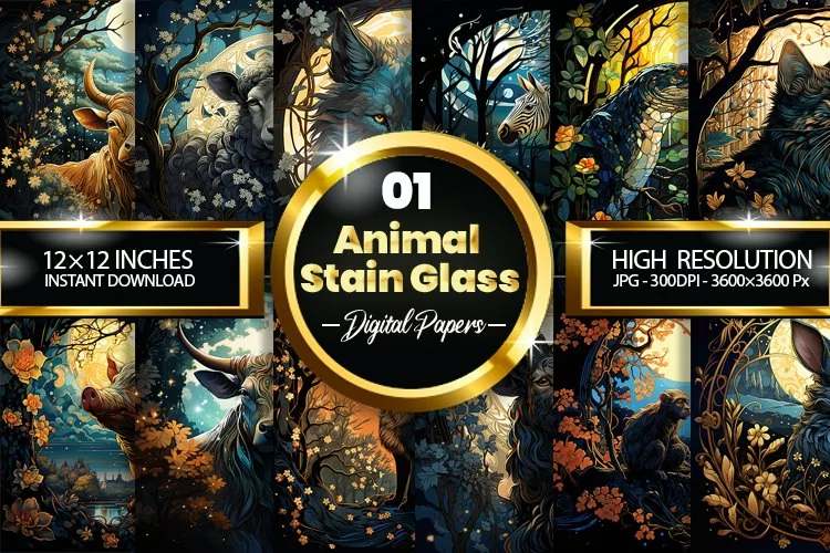 Animal Stained Glass Digital Papers, Animal Paper Volume 01