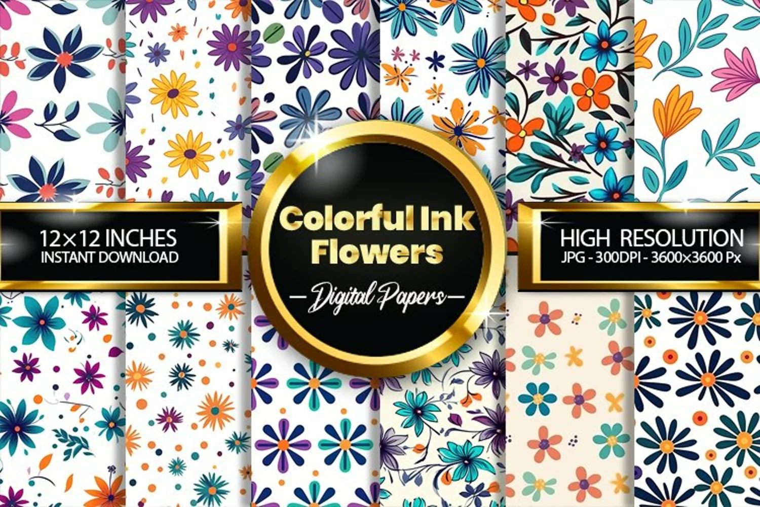 Colorful Ink Seamless Flower Digital Papers, Flowers Pattern