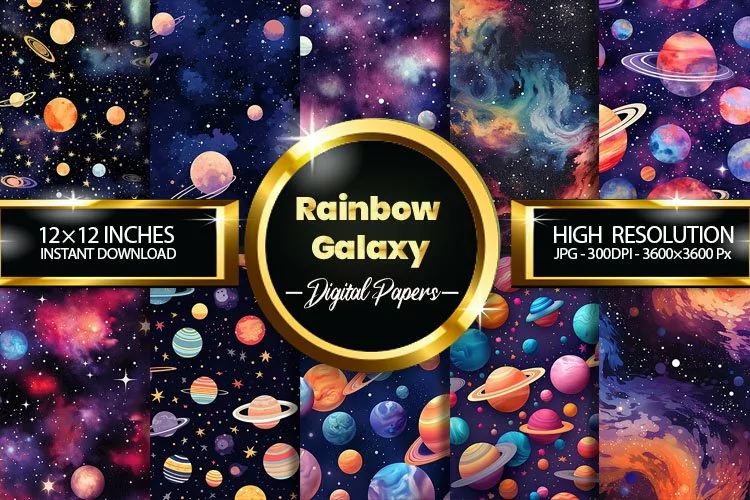 Rainbow  Galaxy Digital Papers is perfect for Gift Wrapping, Promotional Items, Invitations, Wallpaper, Greeting Cards, Planners, Journals, Scrapbook, Notebook Covers, T-Shirts, Mugs, Tumbler, Puzzles, Crafting and much more. This Digital Paper is a popular choice for people on the go.