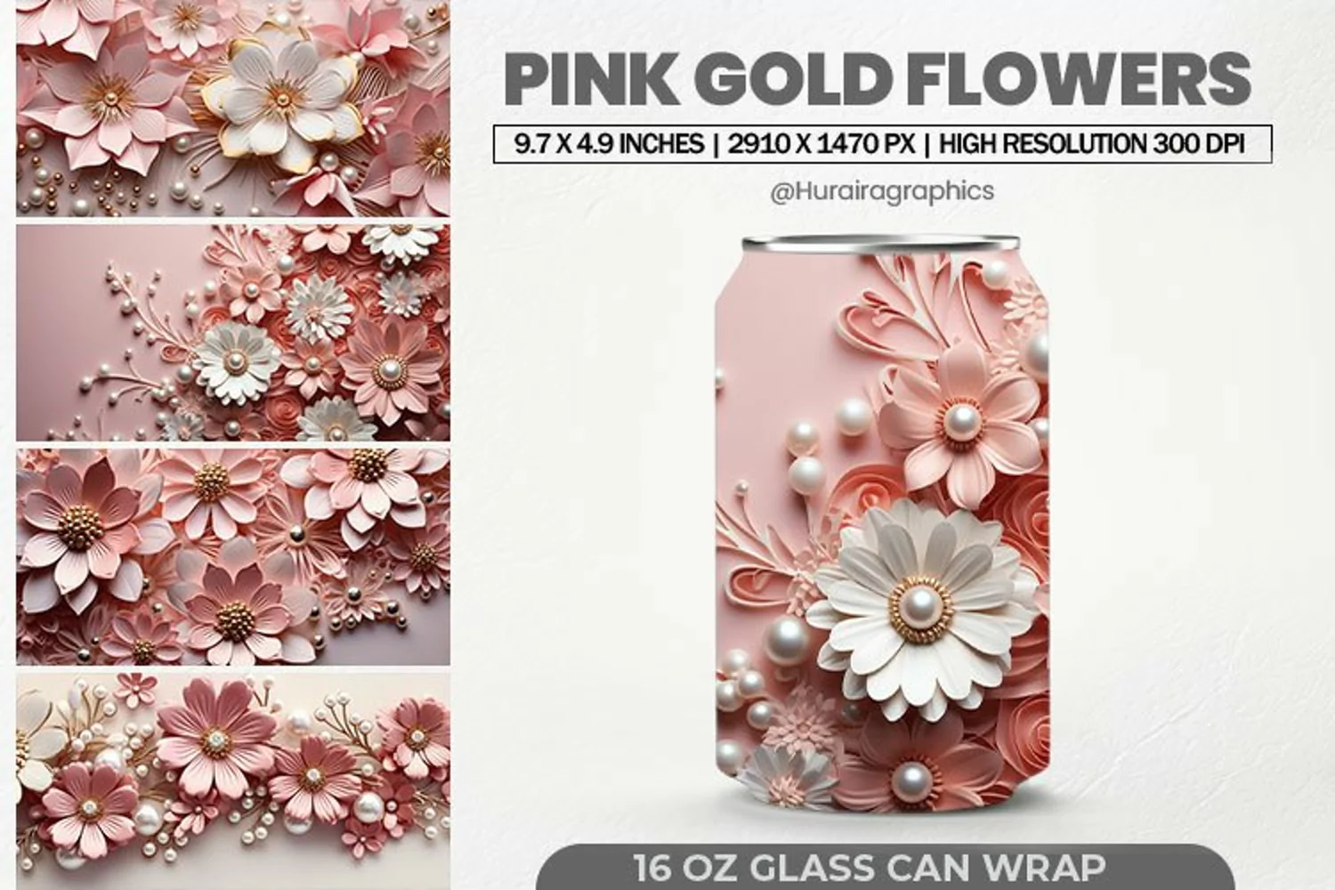 Pink Gold Flowers Glass Can Wrap, 16 Oz Tumbler Sublimation is Perfect and Ready to use.
