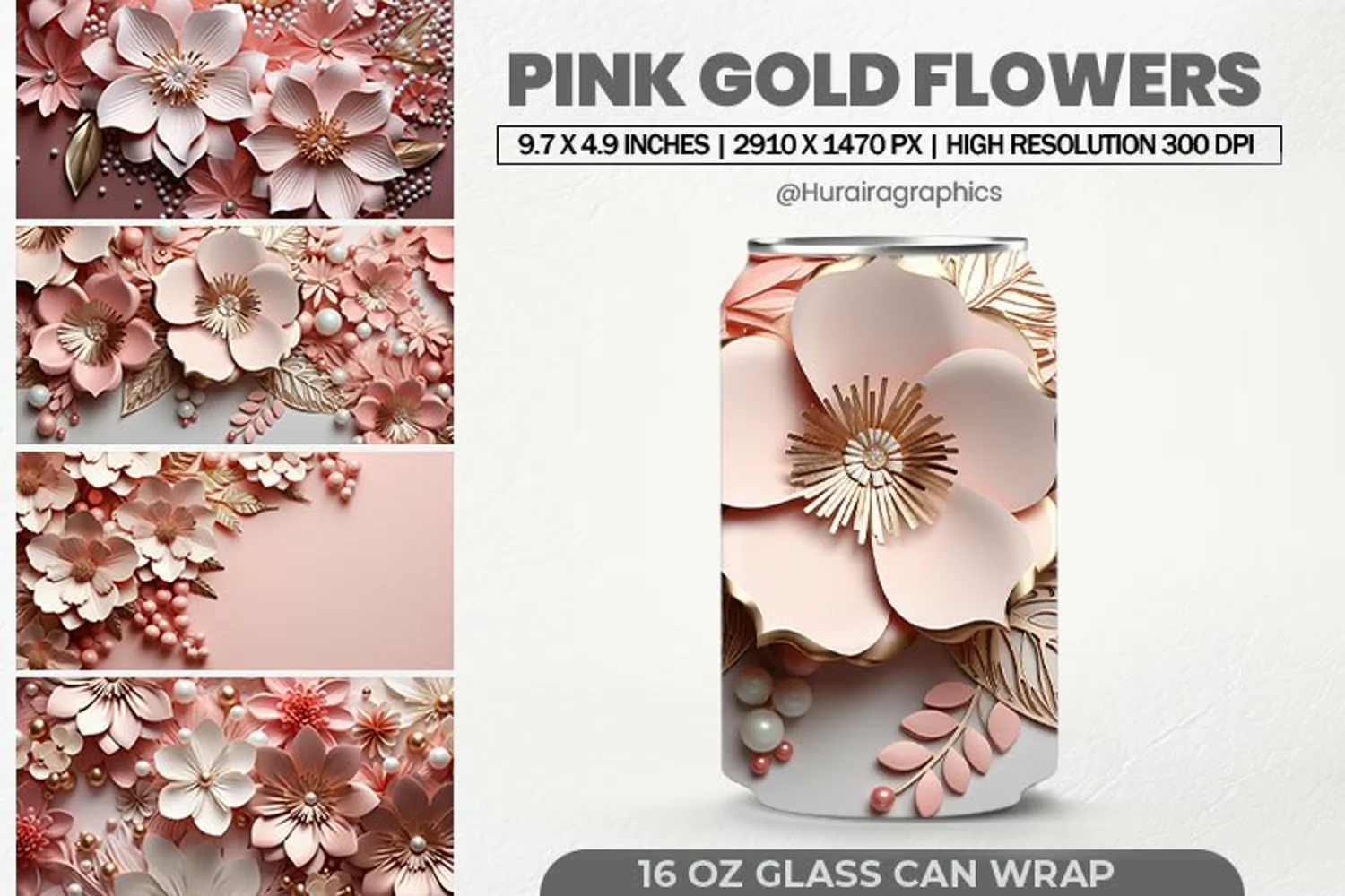 Pink Gold Flowers Glass Can Wrap, 16 Oz Tumbler Sublimation is Perfect and Ready to use.