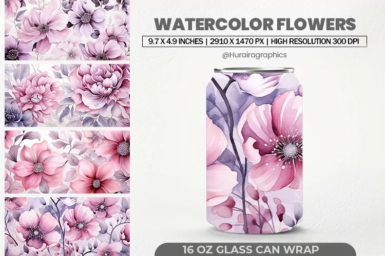 Watercolor Flowers Glass Can Wrap, 16 Oz Tumbler Sublimation is Perfect and Ready to use.