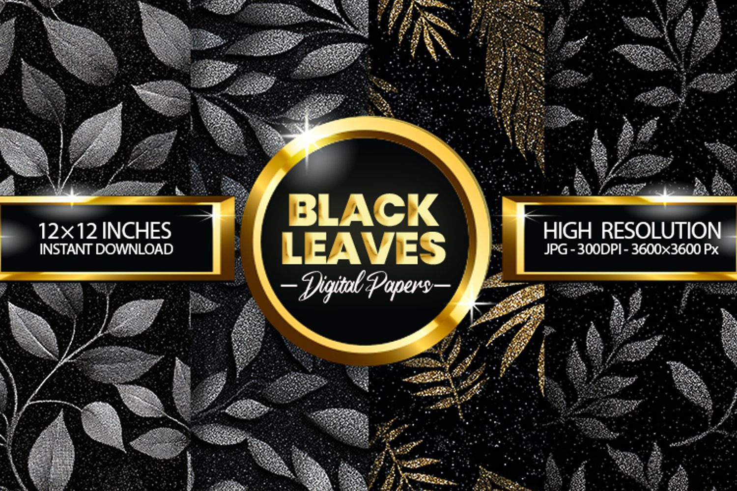 Black Leaves Glitter Digital Papers - 04 Variations
