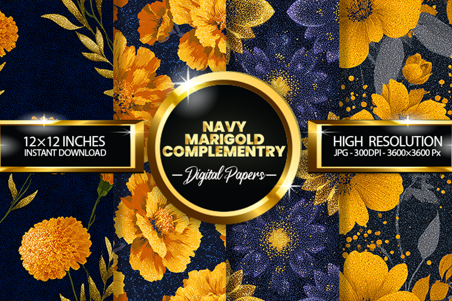 Navy Marigold Complementry Digital Papers is perfect for Gift Wrapping, Promotional Items, Invitations, Wallpaper, Greeting Cards, Planners, Journals, Scrapbook, Notebook Covers, T-Shirts, Mugs, Tumbler, Puzzles, Crafting and much more. This Digital Paper is a popular choice for people on the go.