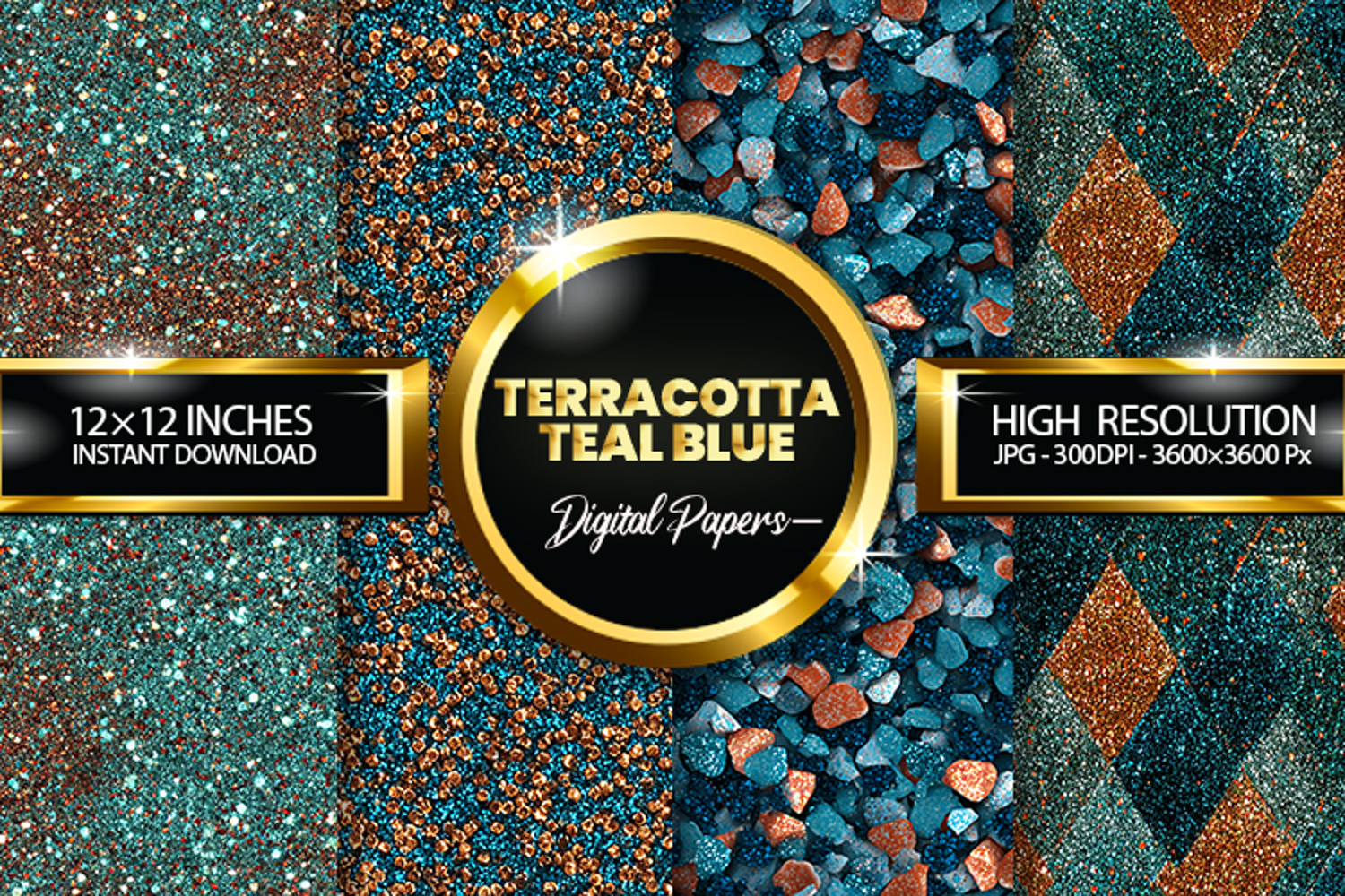 Terracotta Teal Blue Glitter Digital Papers - 04 Varitions