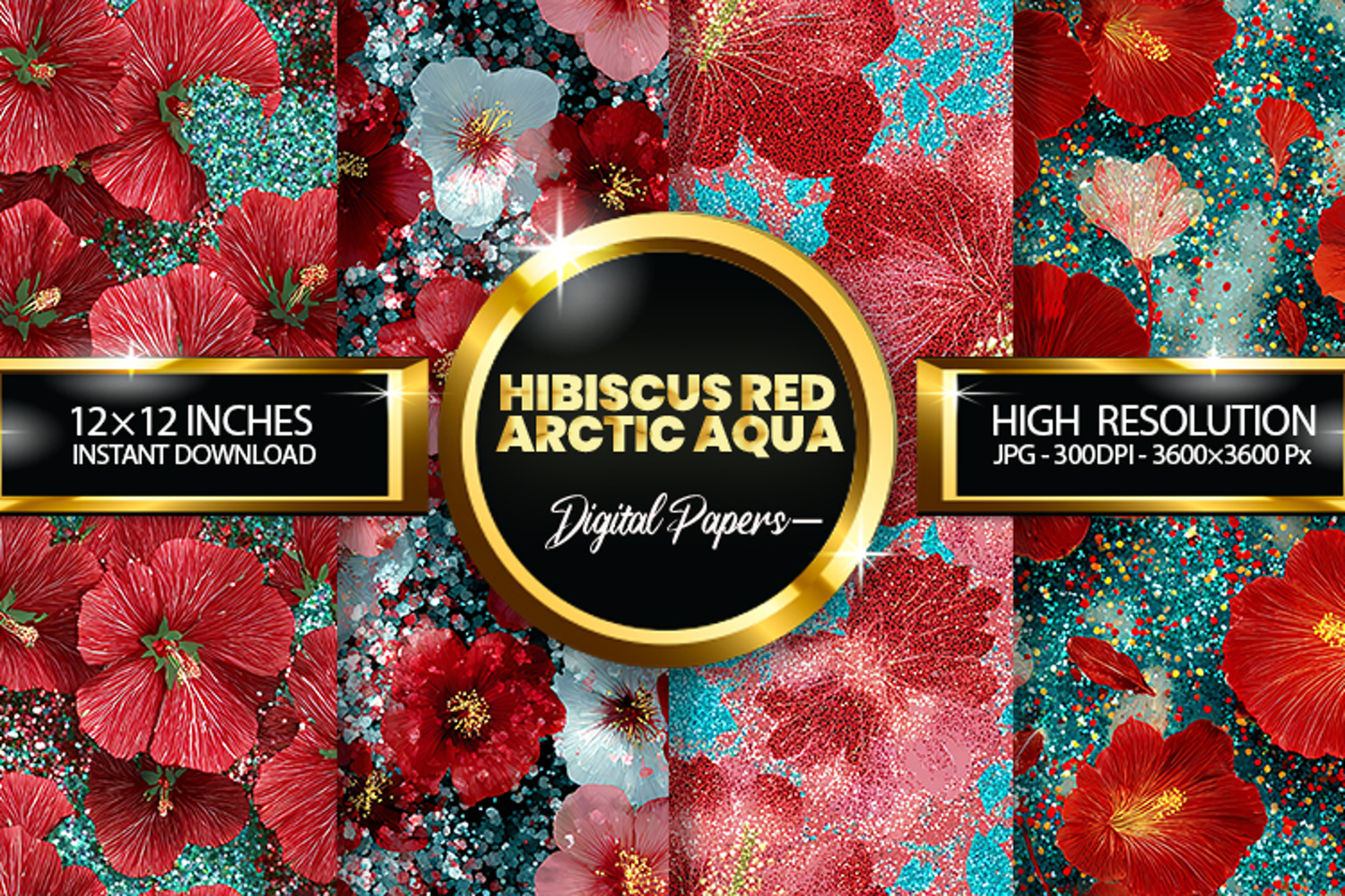 Hibiscus Red Arctic Aqua Glitter Digital Papers