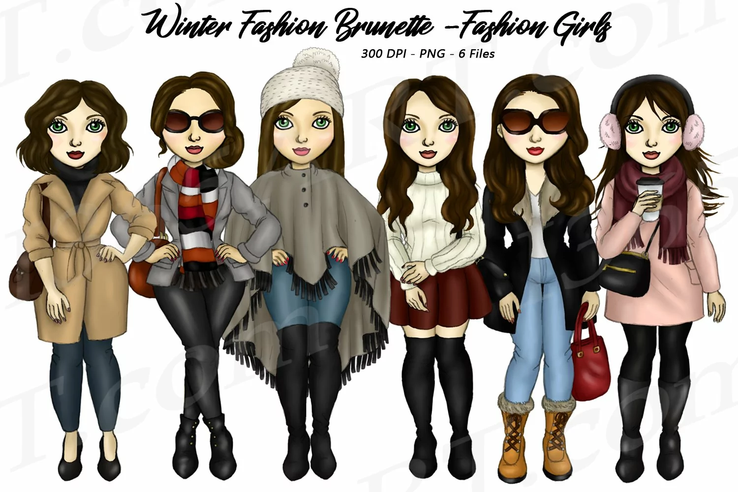 This set contains 6 gorgeous hand drawn Winter fashion girls clipart in seasonal clothing. There are 6 dolls to choose from in this graphic set. Can be used in various projects including planner stickers, stationary, scrapbooking, party invitations, crafts, decorations and more!