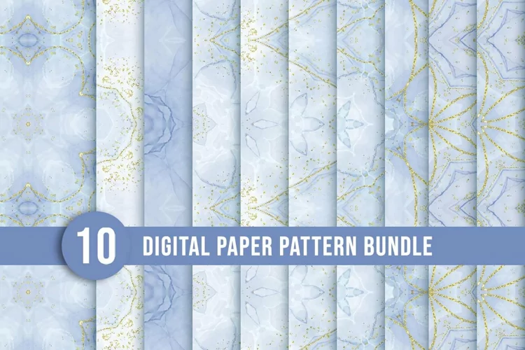 Mandala style pattern design bundle. Hand-drawn mandala paper pattern collection with flower shapes. Beautiful blue and gold watercolor mandala set design. Floral mandala pattern bundle for the floor, cover page, wedding, or wall.