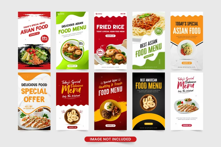 Food menu social media story design. Delicious food menu social media story template collection with red and green colors. Special food promotional web banner set design with abstract shapes. Restaurant advertisement template bundle.