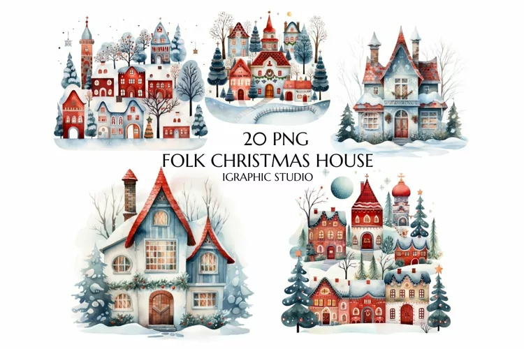 - 20 Scandinavian Christmas House Cliparts, a captivating assortment of watercolor illustrations.