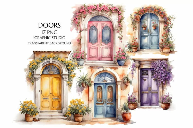 - 17 Watercolor Mediterranean Door Cliparts, a captivating assortment of watercolor illustrations.