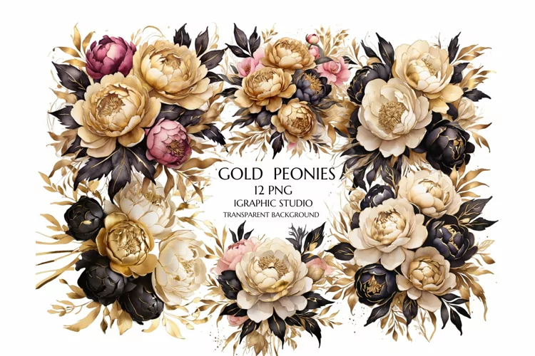 - 12 Watercolor Gold Peony Cliparts, a captivating assortment of watercolor illustrations.