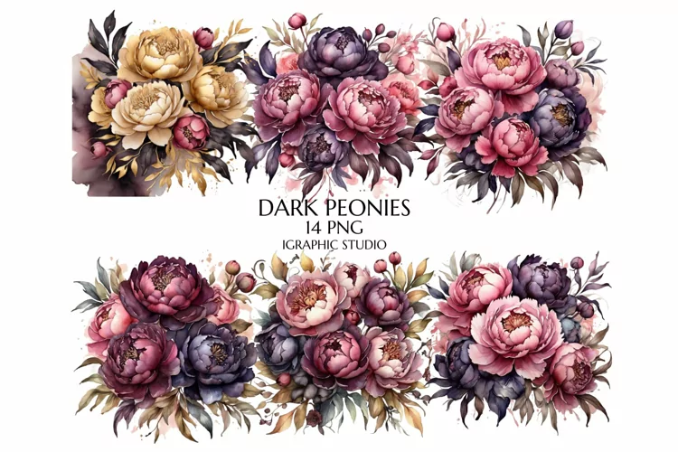 - 14 Watercolor Dark Peony Cliparts, a captivating assortment of watercolor illustrations.