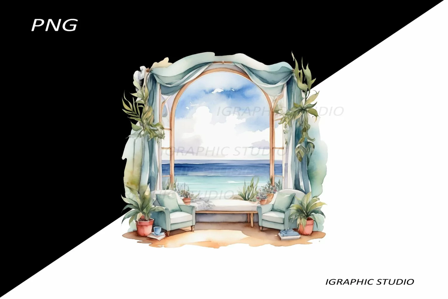 - 1 Sea view Clipart, a captivating assortment of watercolor illustrations.