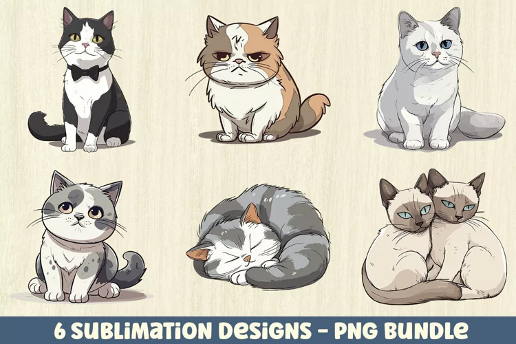 Bundle of 6 hand drawn cats sublimation designs ready to print and press. Works great for shirts, mugs, pillow, towels, and more as well as printing for wall art, the perfect way to add a touch of magic to a wide range of products.