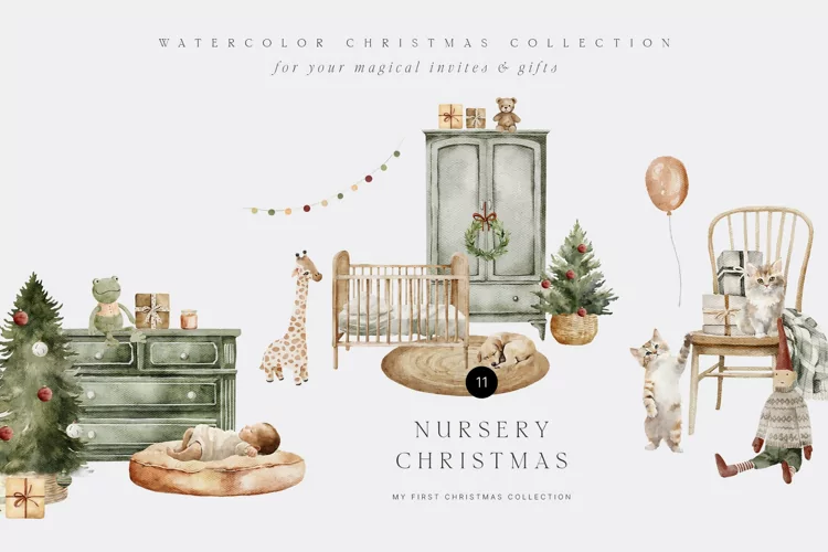 Mini collection of seasonal watercolor Сhristmas compositions with cute baby and festive decor, nursery room, animals, etc.