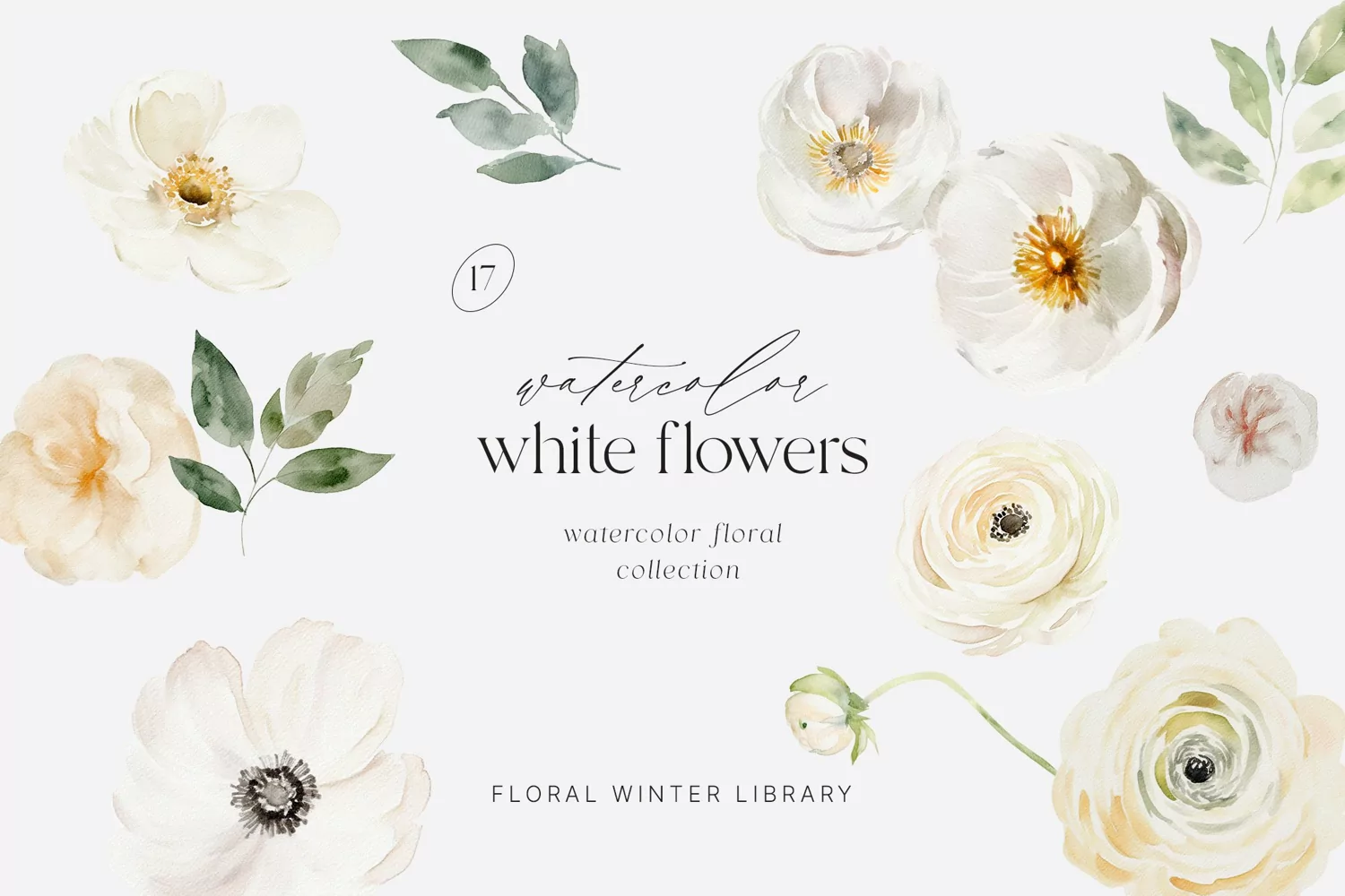 Collection of watercolor white flowers - roses, anemones, ranunculus and greenery for your adorable design.