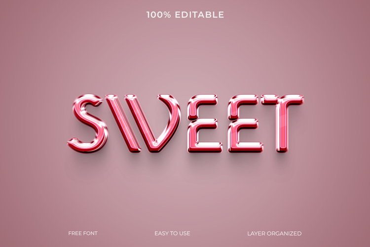 This image features a "SWEET" 3D text effect in a PSD format, with glossy, vibrant pink lettering that shines and sparkles. The text design is clean, modern, and bold, giving it a sweet and eye-catching look perfect for various creative projects. Ideal for use in event promotions, social media campaigns, or branding for products related to sweetness, candy, or fun. This editable PSD template comes with smart objects and organized layers for easy customization. Adjust the text and effects effortlessly to fit your specific needs. Perfect for designs that require a playful and sweet typography style.