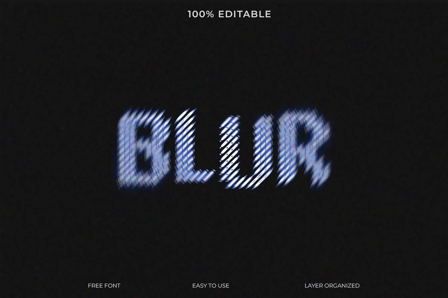 A creative, dynamic motion blur text effect for the word "BLUR." This fully editable template features a striped visual style perfect for creating eye-catching posters, logos, or any design that needs to evoke speed and movement.