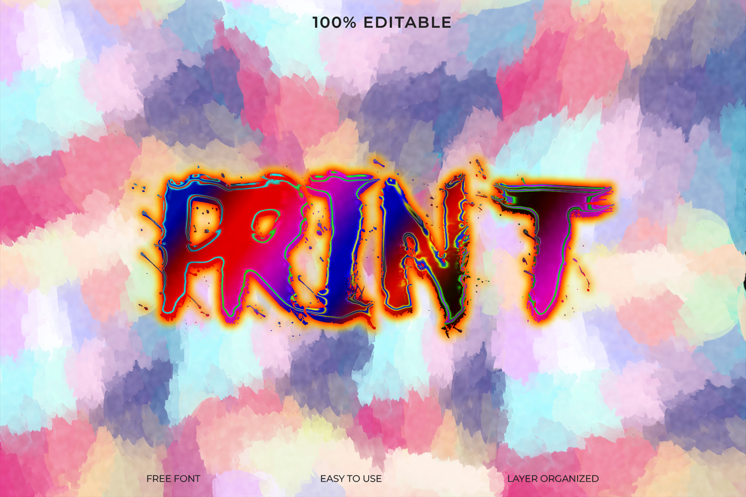 A creative Photoshop template featuring a colorful, distressed "print" text effect with a unique watercolor background, ideal for vibrant graphic design.
