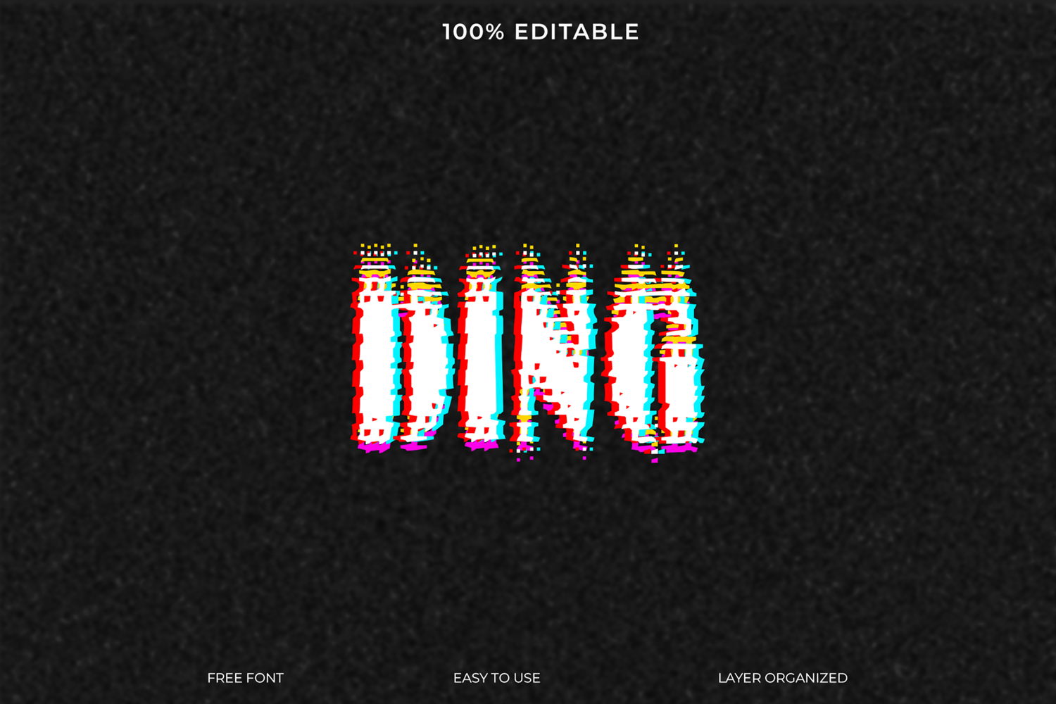 Download this editable digital glitch text effect for Photoshop. The file is easy to use with organized layers, and includes a free font to recreate the pixelated, corrupted design.