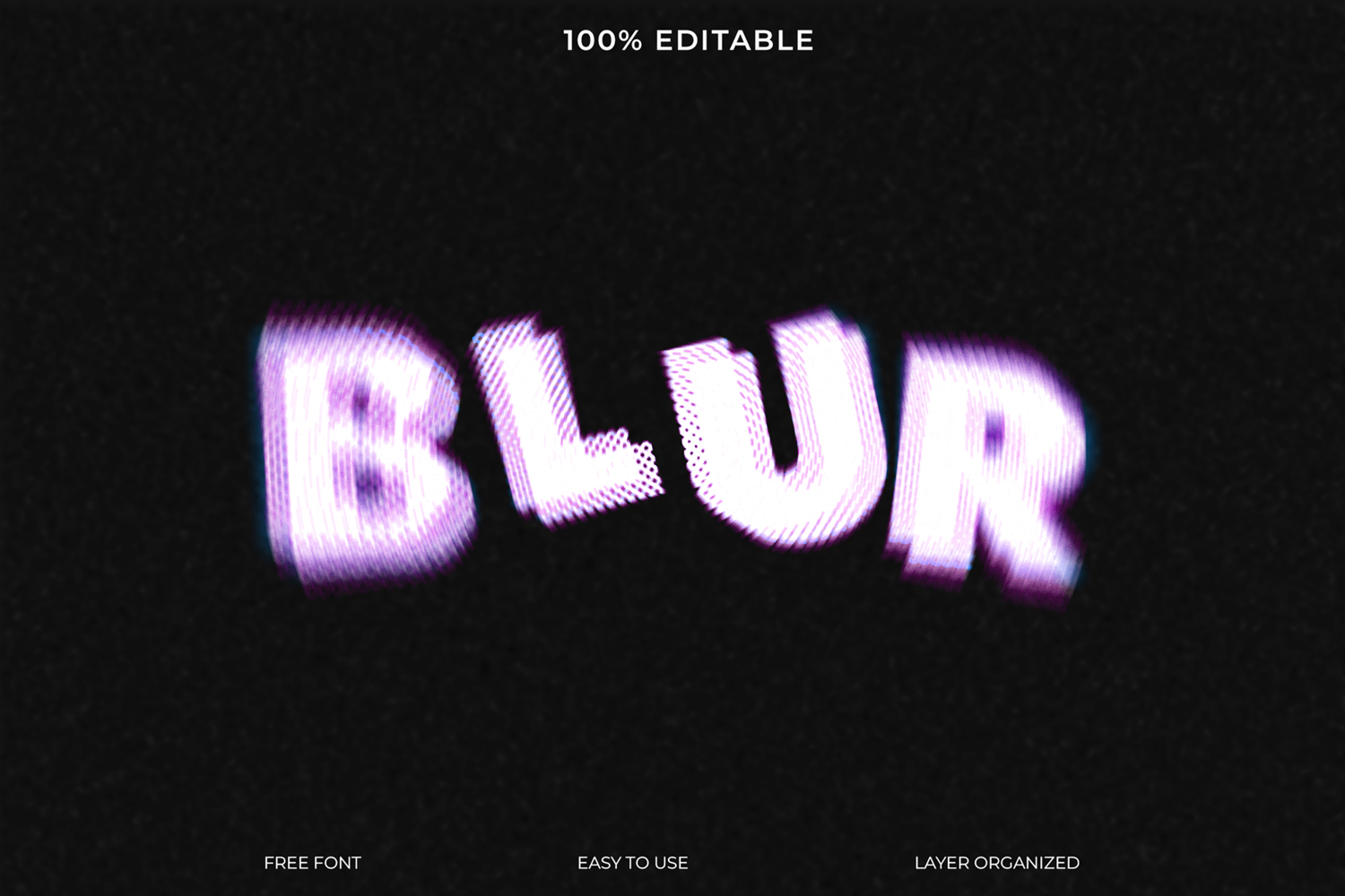 Download this editable blur glitch text effect for Photoshop. The file is easy to use with organized layers, and includes a free font to recreate the pixelated, corrupted design.