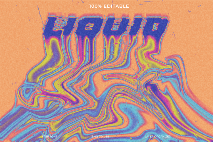 Download this editable liquid melted text effect for Photoshop. The file is easy to use with organized layers, and includes a free font to recreate this abstract, psychedelic design.