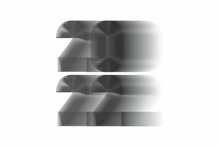2022 Happy New Year. Abstract geometric cover design background. 3d dimensional 2022 numbers in thin lines striped style vector illustration. Banner, label, flyer, poster. Black white isolated